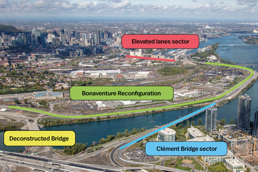 The Samuel De Champlain Bridge (Hwy. 15 South) and the northern point of Île des Sœurs are linked to the Bonaventure Expressway through road structures that include the Clément Bridge. This bridge spans a branch of the St. Lawrence River at the northern point of Île des Sœurs to then meet up with the Bonaventure Expressway. Built in 1966, this aging infrastructure requires work to remain functional.