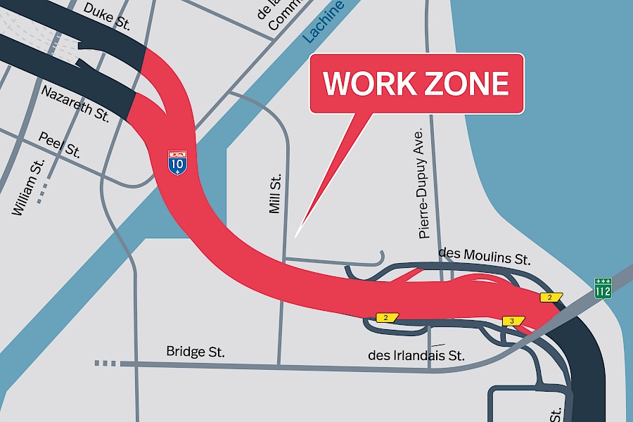 • Access from the northern point of Île des Soeurs to the Bonaventure Expy. toward downtown will be closed as of September 2025. The detour will be via Gaétan-Laberge boulevard.