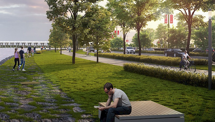 Le boulevard sera doté d’un corridor vert, soit des aménagements permettant à la population d’être à proximité du fleuve Saint-Laurent et des voies de mobilité active en site propre, inexistantes dans le secteur, seront également incluses.