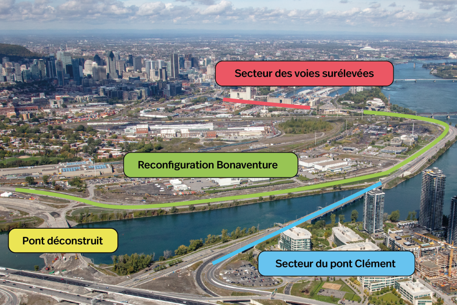 Le pont Samuel-De Champlain (A-15 sud) et la pointe nord de l’île des Sœurs sont reliés à l’autoroute Bonaventure par une série d’infrastructures routières, dont le pont Clément. Ce dernier permet d’enjamber un bras du fleuve St-Laurent, à la jonction de la pointe nord de l’île des Sœurs, pour rejoindre l’autoroute Bonaventure. Construites en 1966, ces infrastructures sont vieillissantes et demandent quelques travaux pour demeurer fonctionnelles.