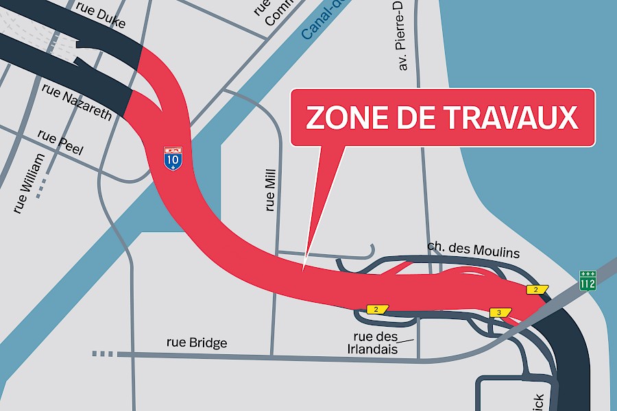 Les accès en provenance de la pointe nord de l’Île des Soeurs vers l’A-Bonaventure en direction du centre-ville seront fermés jusqu’au mois de septembre 2025. Le détour se fera par le boulevard Gaétan-Laberge.